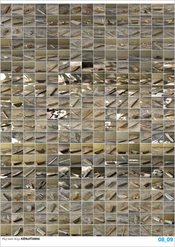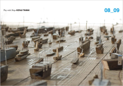 08_09 Play with Shipsは大阪枚方星ヶ丘の喫茶「SEWING TABLE COFFEE」の店主 玉井健二が2008年〜2009年の間に制作した、一日一艘の記録の船が収められた本です。玉井自身、作家としての活動をしているわけではなく、この船を作るきっかけは喫茶店と同じ敷地内にある古い木造校舎の洋裁学校の廃材を手にした時に、何となく仕上がったものが船だったと言います。作り始めると気に入ってくれた人もいて、船を欲しいと言ってくれる人もいました。展示を開いたらどうかという声もあり、2008年〜2009年までの間、日々の記録のつもりで一日一艘を目指しコツコツと作り始め、最終的に300艘の船を仕上げ、2009年11月に喫茶と同じ敷地内にあるソーイングギャラリーにて個展を開催しました(個展の様子はこちらです)。玉井は美術の訓練を受けてきたわけではありませんし、作家という意識を持っておりません。また制作している船も「作品」とは呼びません。船は作品ではなく、ある一日の記録です。ただありのまま、手が動くまま作られた船だからこそ、魅力を感じることができるのだと思います。本書では、合計300艘の作品の一部と、制作中に綴った制作日記も一部抜粋して構成しております。また300艘全ての舟が並べたポスターが付録として付いてます。