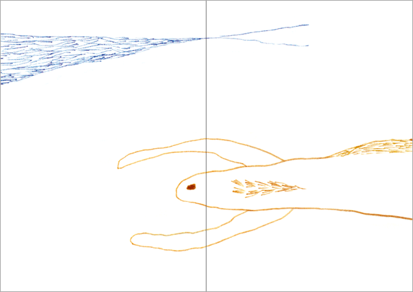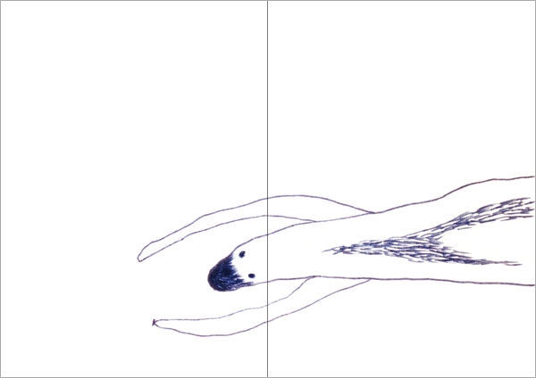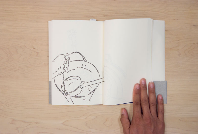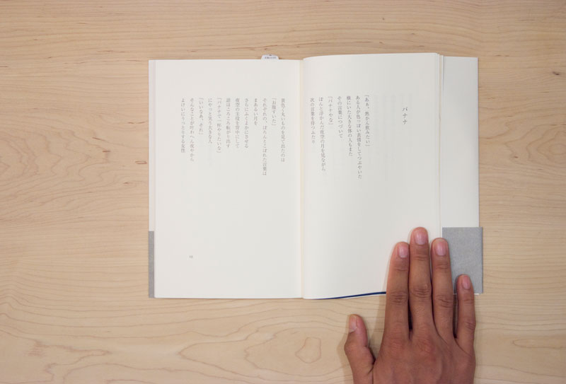 「無国」に収められた作品は布地に描かれているため、布目がうっすらと見える線になっています。布目があることで、紙に比べ自由な線が描きにくく、普段よりもさらに歪に描かれてるのがこの作品の面白さではないかと思います。そして彼女の絵の魅力を伝わりやすくするため、本の中の絵は実寸サイズになっています。