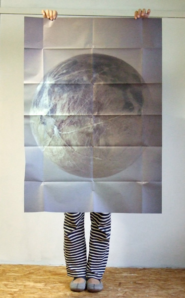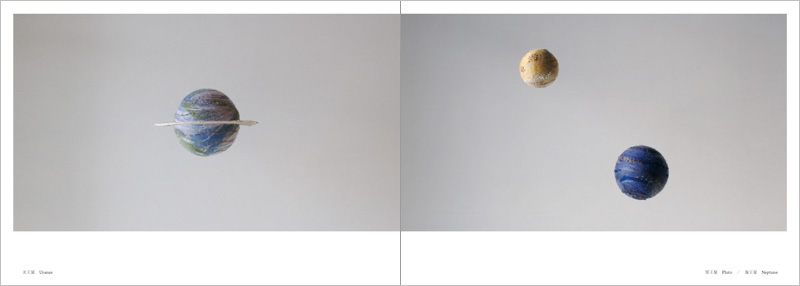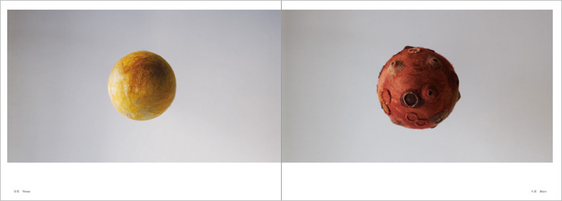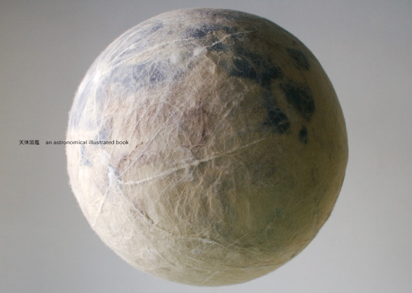 「天体図鑑」は関西で活動しているフェルトアートユニット「毛マニア(けまにあ)」の作品集です。毛マニアは、その名の通り原毛からフェルトを作り様々な立体作品を制作する女性2人組の作家です。本書では、昨年12月に大阪beyerで行った展示「冬の夜」展で発表した惑星作品が収められています。様々な色のフェルトを組み合わせて制作されたカラフルな惑星が浮かびます。作品は大きいもので直径63cmを超え、とても大胆な作品ではありますが、フェルト独特の質感を活かして惑星の地表表面のクレーターや模様など細部まで再現するなど繊細な手仕事ぶりも伺えます。