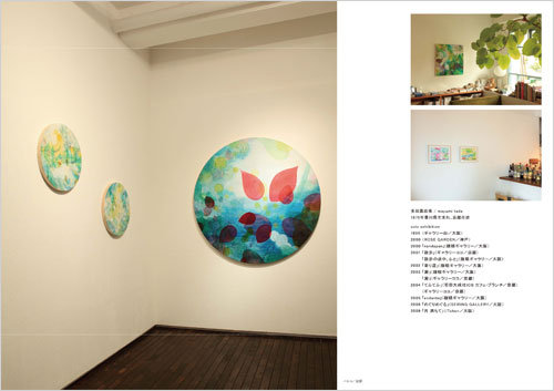 多田真由美は関西を中心に積極的に作品発表も行い、近年は変形の木製パネルに油絵を描く半立体のような絵画作品を発表しております。彼女の作品は情景と感情が入り交じった独特の色彩があり、見つめていると古い記憶が蘇るような気がしてなりません。本書には2008年にソーイングギャラリー(大阪/枚方)、2009年にiTohen(大阪/中崎町)で行った二つの作品群が収められており、表と裏が両方表紙となった両A面の本になっています。個人的な話になりますが、2009年の作品発表の前に多田は初めての出産を経験し「月 満ちて」は出産後に描かれた作品となっておりますので、この本では母になる前と母になってからの心情の変化も見て取るができる気がします。