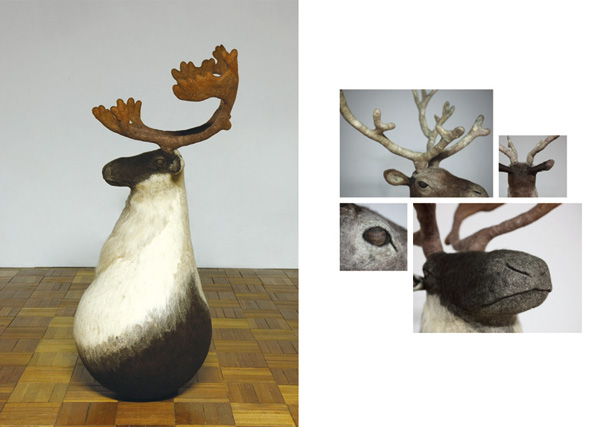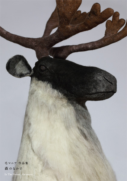 「森のなかで」は関西で活動しているフェルトアートユニット「毛マニア(けまにあ)」の作品集です。今回は動物をモチーフにした作品集となっています。この動物は架空のものなのか実在するものなのか、その形を見ると悩んでしまいます。これは森の中に足を踏み入れた毛マニアが感じた生き物の息吹を形にしているからでしょう。彼女達の想像が作りだした動物の形はヘンテコです。ヘンテコでも、その表情を見ると、フェルトで製作されたとは思えないほどリアルで、一見それは本物です。動物は触れると、起き上がり小法師になっているところも、毛マニアらしい遊びです。